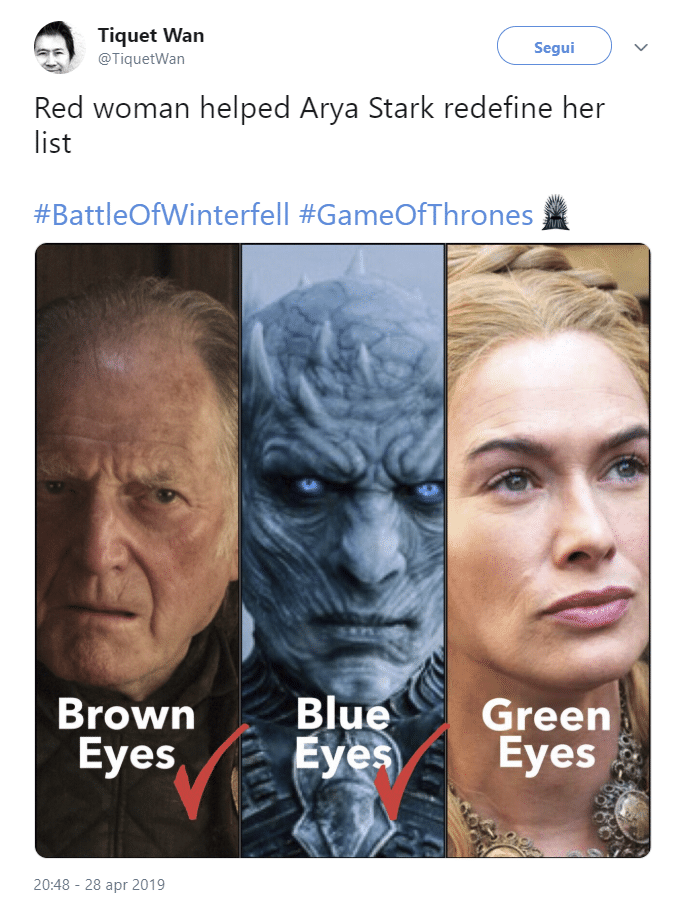 La Lunga Notte è arrivata e a spuntarla è stata l’abile Arya Stark che ha ucciso il Re degli Estranei. Una vittoria sconvolgente e inaspettata, o forse non tanto: del resto, Melisandre l’aveva già detto nella terza stagione. All’epoca, le due s’incrociarono perché la donna rossa aveva rapito Gendry. “Vedo dell’oscurità in te. E nell’oscurità, occhi che mi fissano. Occhi marroni, blu e verdi. Occhi che tu chiuderai per sempre”, le aveva detto.