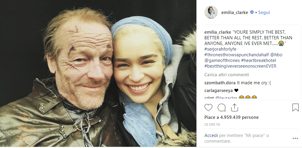Dulcis in fundo, a dare il proprio contributo nello scenario apocalittico degli spoiler è stata Emilia Clarke, la cara Daenerys, che ha pubblicato uno scatto da dietro le quinte di Dany e Jorah.