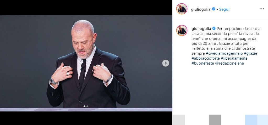 Un post su Instagram che ha scatenato un polverone sui social: stamattina, martedì 24 dicembre 2019, il celebre volto de Le Iene, Giulio Golia, ha salutato i suoi fan lasciando intendere che lascia il programma di Italia 1. O almeno, è stata questa l’interpretazione data al suo messaggio da molti utenti e da alcuni giornali italiani.