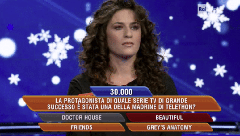 Così recitava la domanda: La protagonista di quale serie tv di grande successo è stata una delle madrine di Telethon? La scelta a quattro voci indicava Doctor House, Beautiful, Friends e Grey’s Anatomy.