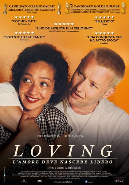 Loving è un film del 2016 diretto da Jeff Nichols candidato agli Oscar per la categoria di miglior attrice protagonista a Ruth Negga; l’attrice, etiope naturalizzata irlandese, è conosciuta per aver recitato in 12 anni schiavo, Fury e Breakfast on Pluto.