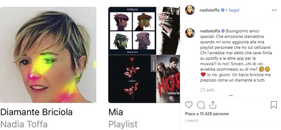 “Che emozione stamattina quando mi sono aggiunta alla mia playlist personale che ho sul cellulare!  Chi l’avrebbe mai detto che sarei finita su spotify e le altre app per la musica?! Io no!! Sinceri…chi di voi avrebbe scommesso su di me?”, scriveva Nadia a commento della notizia sul suo profilo social.