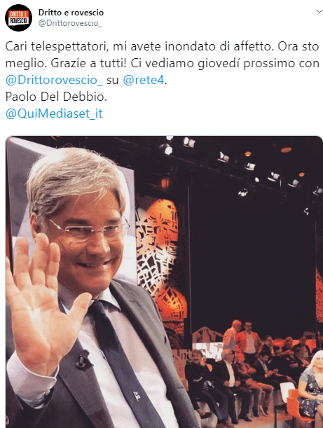 A dare un aggiornamento è stato proprio Paolo Del Debbio. Tramite l’account Twitter di Diritto e Rovescio, ha specificato di star meglio. “Cari telespettatori, mi avete inondato di affetto. Ora sto meglio. Grazie a tutti. Ci vediamo giovedì prossimo”.
