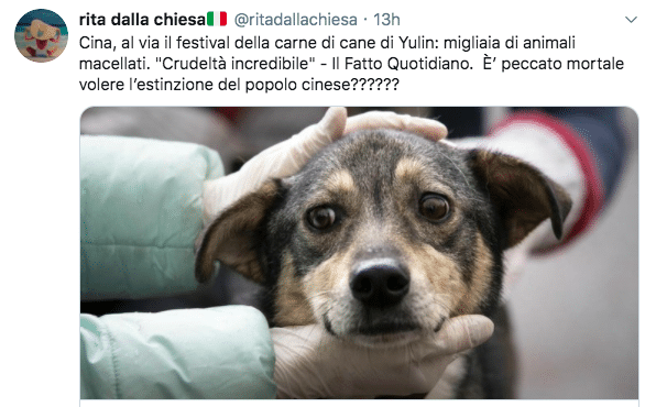 “È un peccato mortale volere l’estinzione del popolo cinese?”. Così Rita Dalla Chiesa commenta su Twitter la notizia del Festival della carne di cane di Yulin. Un’affermazione forte quella della conduttrice tv, nonché figlia del compianto Generale Dalla Chiesa, che rischia di creare un incidente diplomatico con la Cina. Sul fatto che i cani siano amici e non cibo da mettere a tavola siamo tutti d’accordo. Quella di mangiare gli animali domestici è una tradizione che per per molti di noi resta inconcepibile, ma è giusto precisare anche che l’abitudine alimentare di mangiare cani non è seguita da tutta la popolazione cinese e in genere è osteggiata dagli altri. Inoltre conosciamo tutti il trattamento subito dagli animali durante il contestato evento della provincia meridionale del Guangxi. Ma persino questo non giustifica le gravissime affermazioni di Rita Dalla Chiesa che alimentano un pregiudizio razzista già rinforzato a inizio pandemia per l’origine del virus a Wuhan. Verrebbe da chiedersi: e allora noi che in Italia abbiamo la Mafia? Gli altri Paesi sono legittimati a pensare che l’intera popolazione italiana dovrebbero estinguersi?