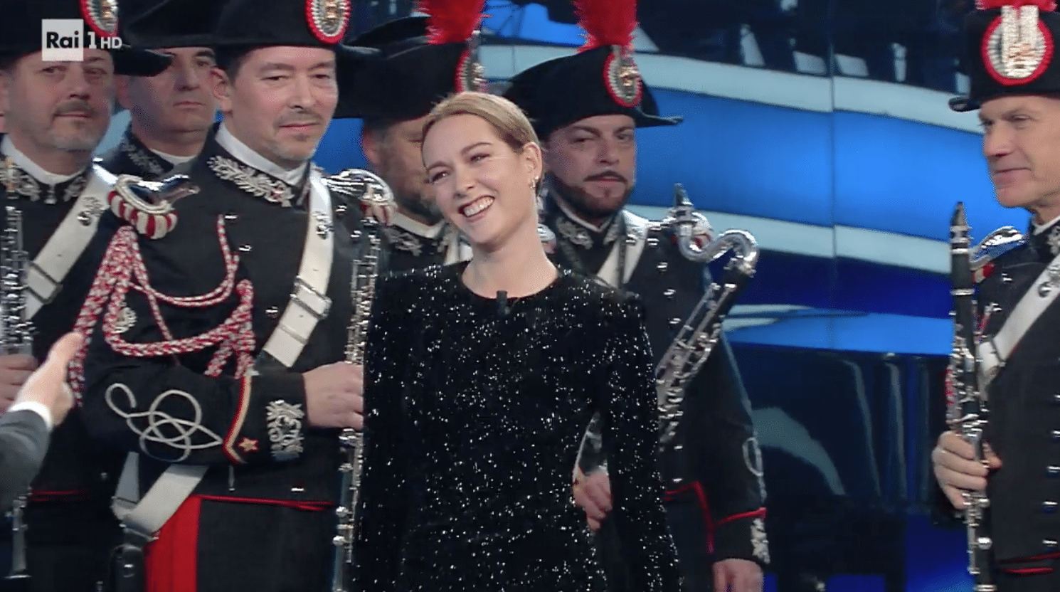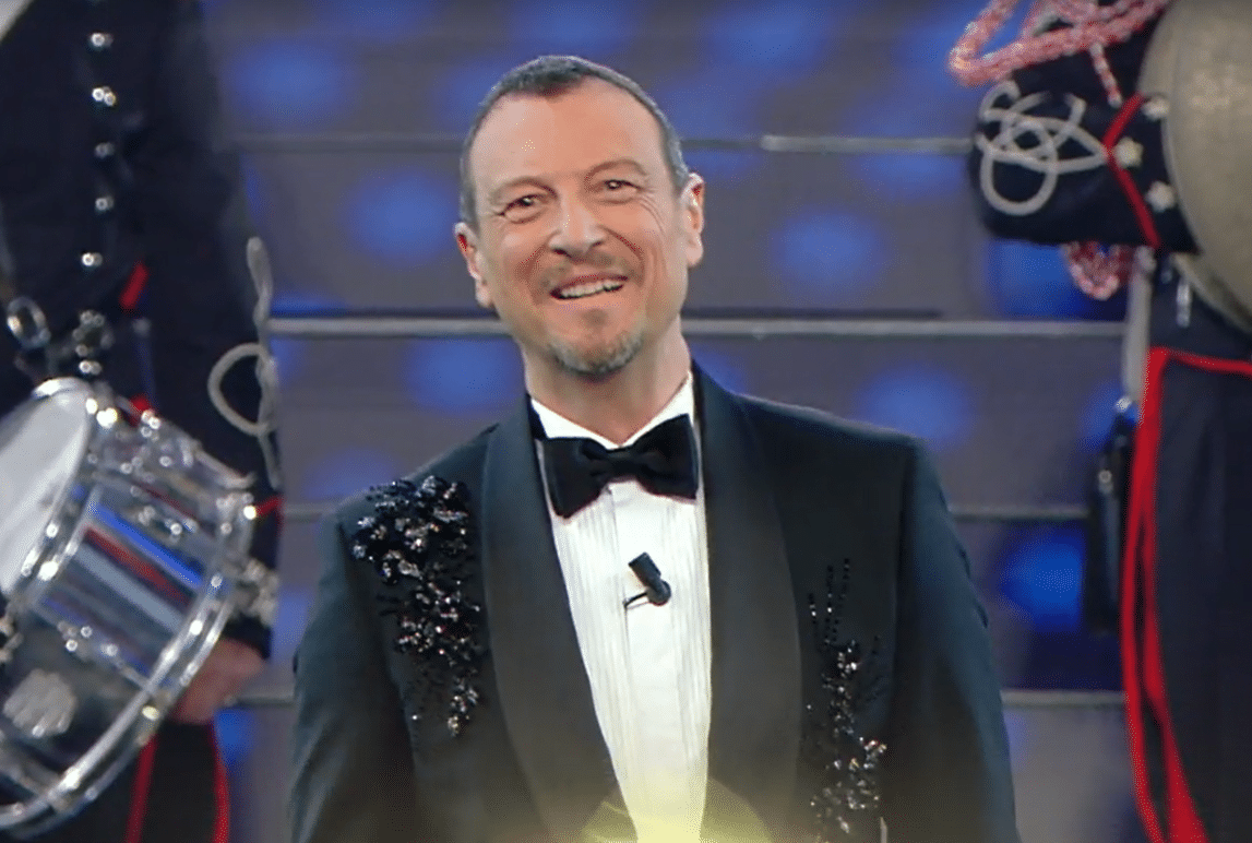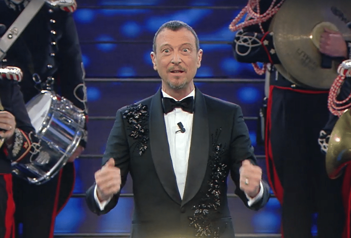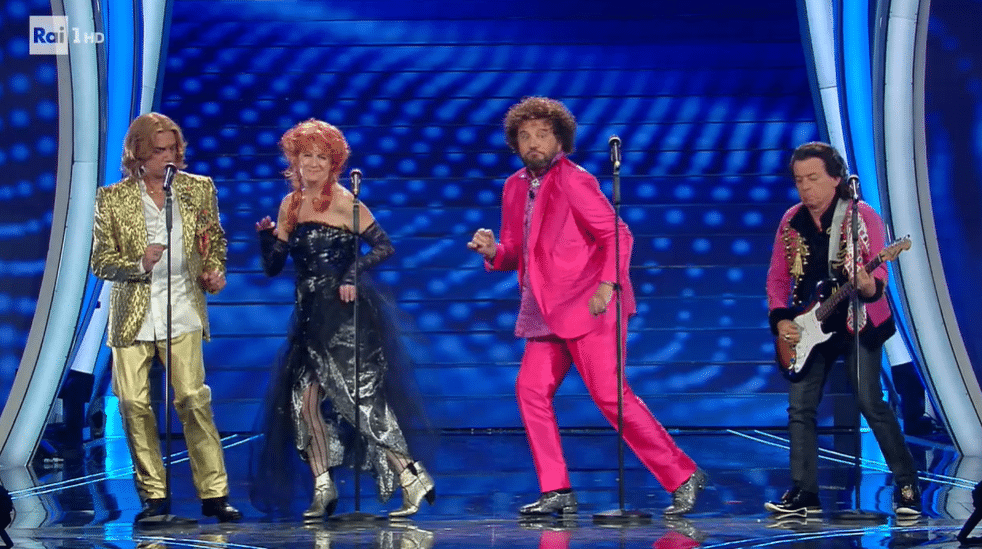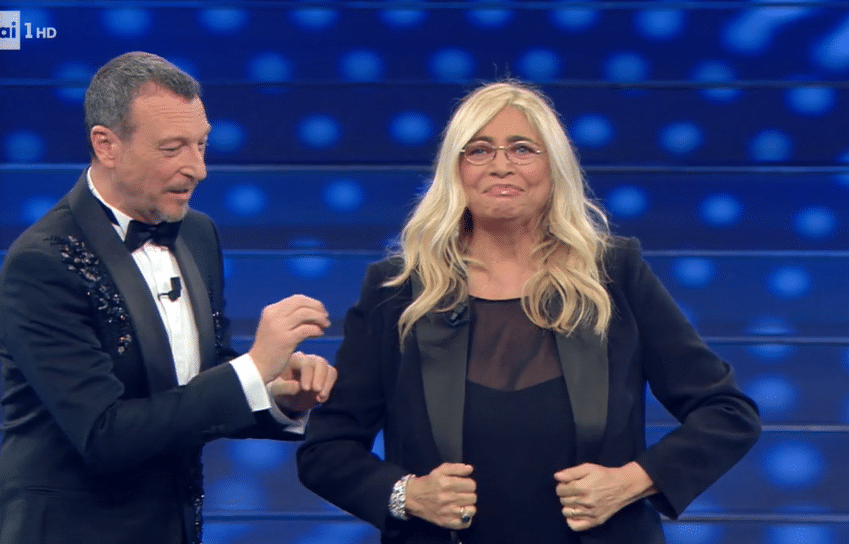 Fiorello invece indossa una giacca di velluto blu con un taschino glitterato, ma a stupire tutti è l’amico Amadeus, che per aver perso la scommessa indossa la parrucca bionda alla Maria De Filippi.
