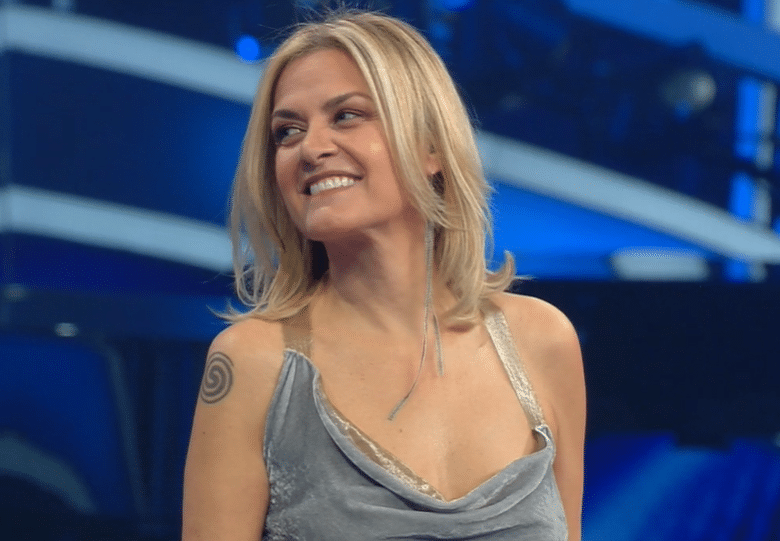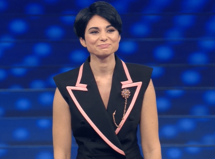 Sabrina Salerno si adegua al look di Amadeus e sfoggia un tailleur total black tempestato di payette.