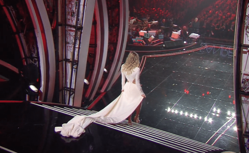 Diletta torna all’Ariston indossando un abito che ricorda il Festival di Cannes, in tonalità bianco-oro con un lungo strascico e una gonna corta sul davanti.