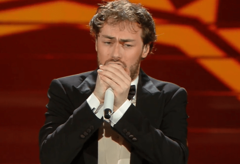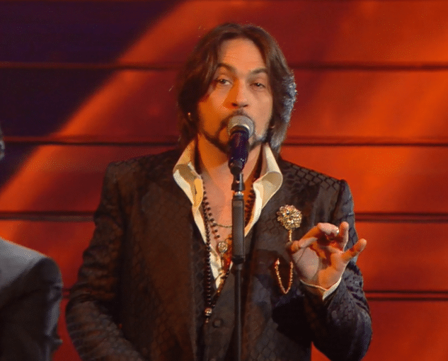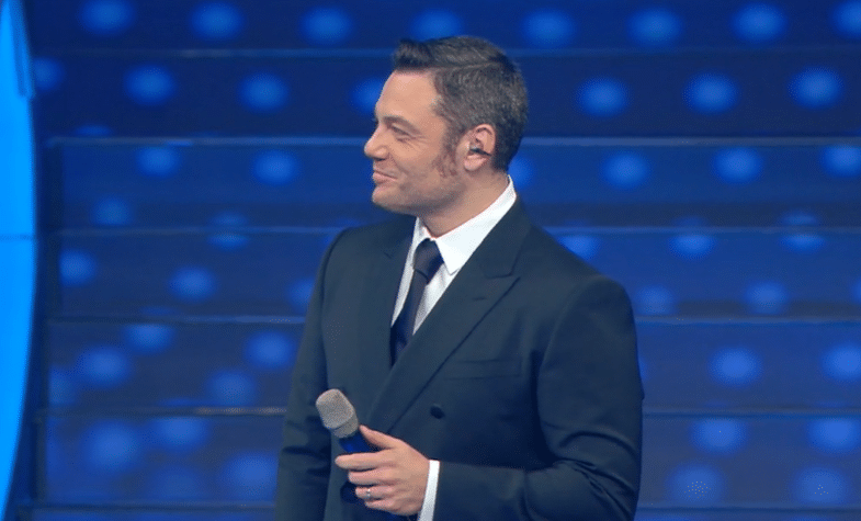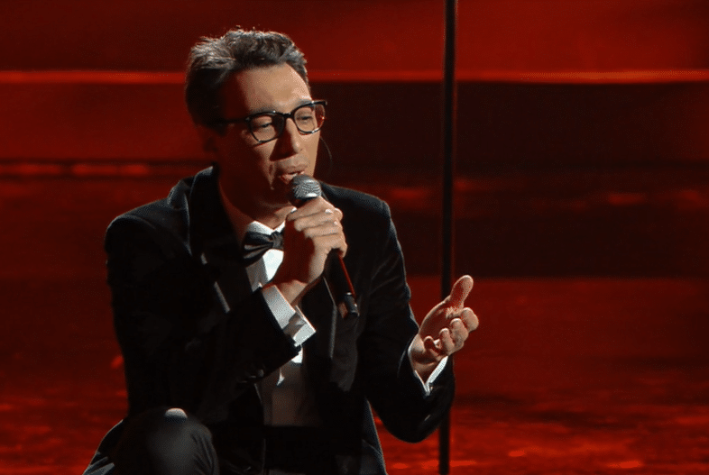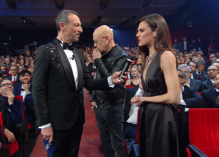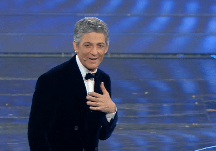 Per l’ultima serata del Festival, il direttore artistico si presenta in look black & white con un tocco di strass a tempestare la giacca in alto a sinistra e in basso a destra.