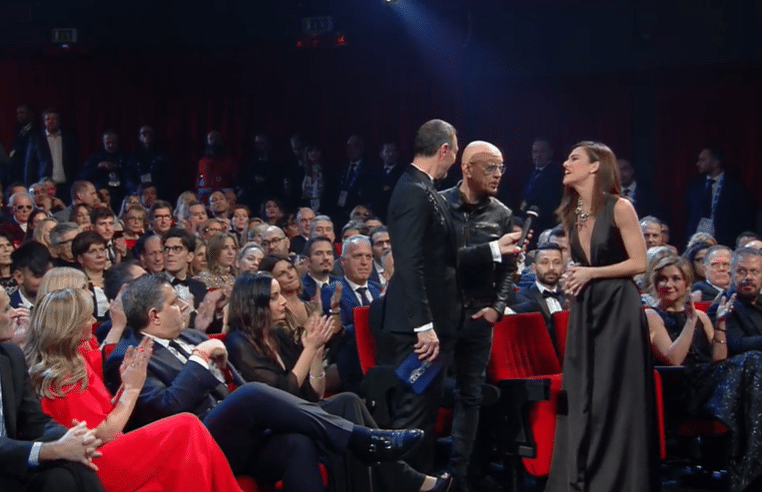 Per Cristiana Capotondi invece look total black, o quasi: talmente riempita di brillantini da luccicare più di Amadeus!