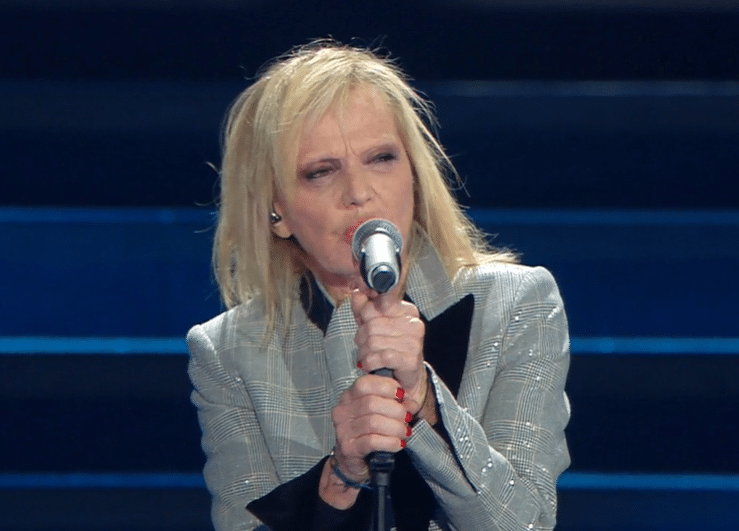 Irene Grandi indossa un lungo abito in velluto con una generosa scollatura, il cui colore si sposa armoniosamente con la tonalità chiara della cantante.