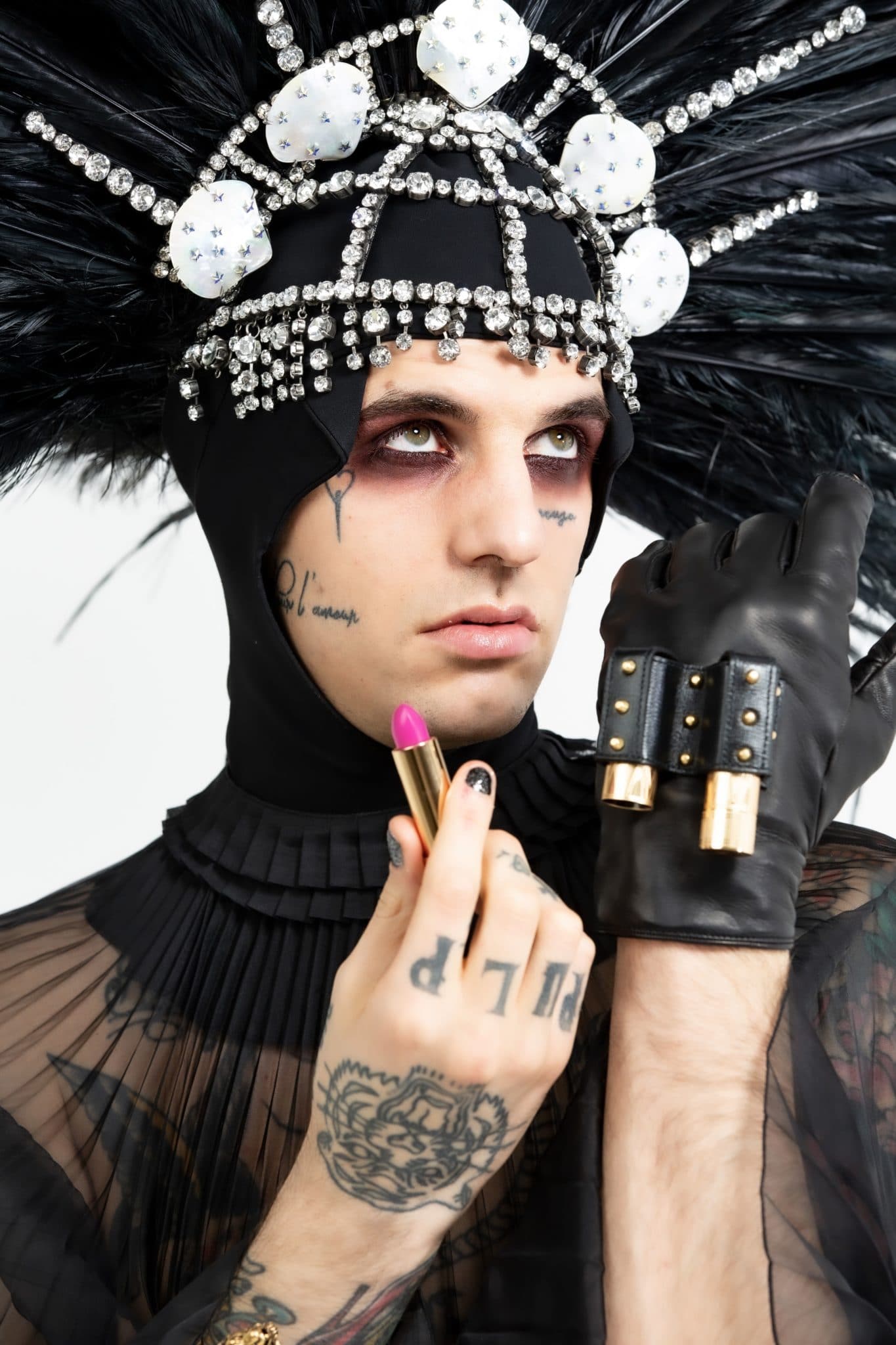 A sorpresa, Lauro ha estratto da uno speciale guanto un rossetto Gucci con cui si è truccato le labbra. La figura della Marchesa Casati, con la sua vita controversa, è stata un personaggio di grande rottura e in anticipo sui tempi: performer prima della performing art. Si circondava di un’umanità complessa variegata, frequentando i massimi intellettuali dell’epoca ma anche la gente di strada, eccentrica al punto da diventare anch’essa un’icona.