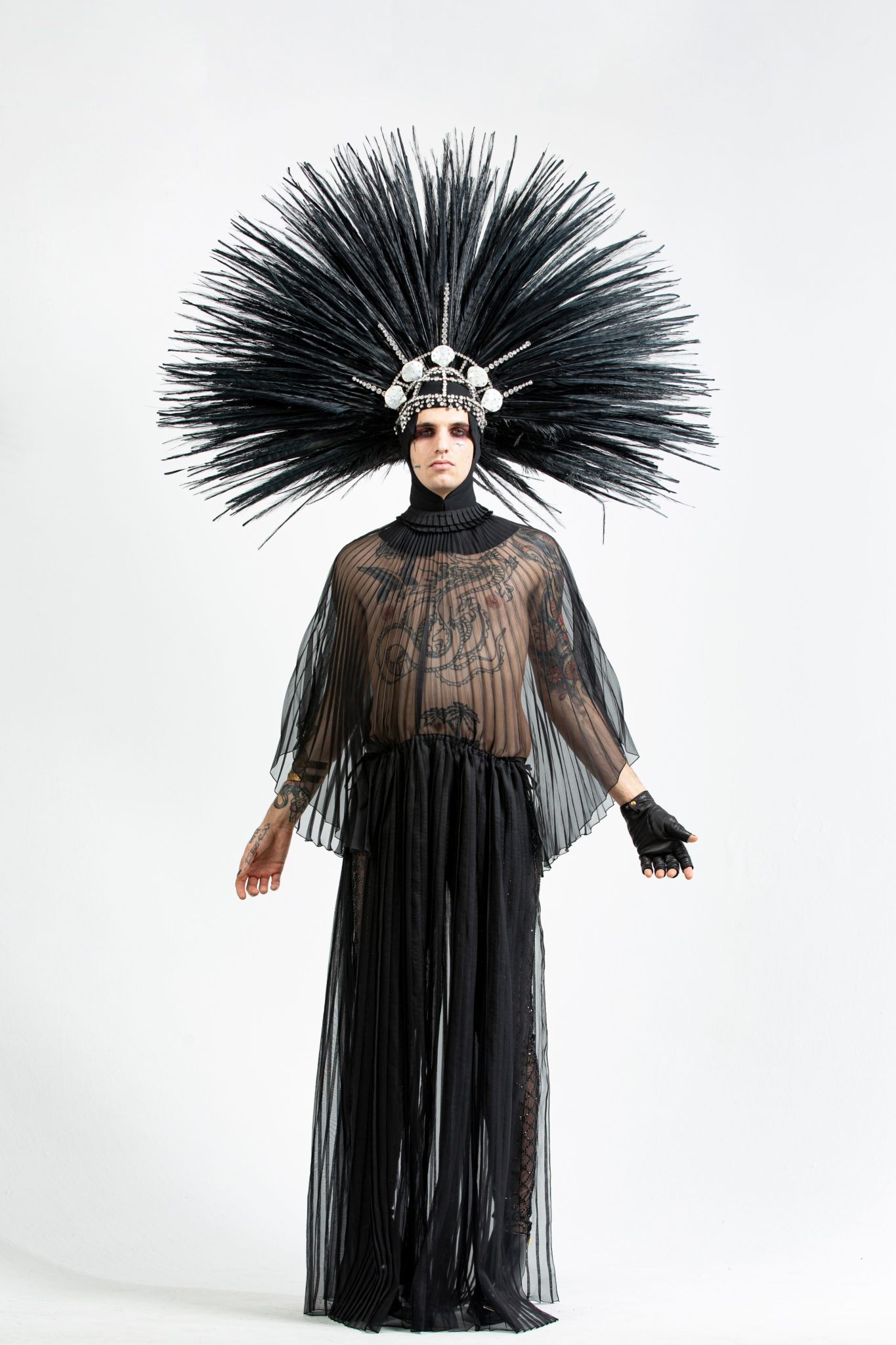 Lauro ha interpretato questo personaggio istrionico ed eclettico, scegliendo un look disegnato da Alessandro Michele, direttore creativo di Gucci. In testa, uno scenografico copricapo di piume con inserti di cristalli. Sotto, un abito di chiffon nero completamente trasparente e dei collant tailor made, con motivo geometrico di cristalli neri.