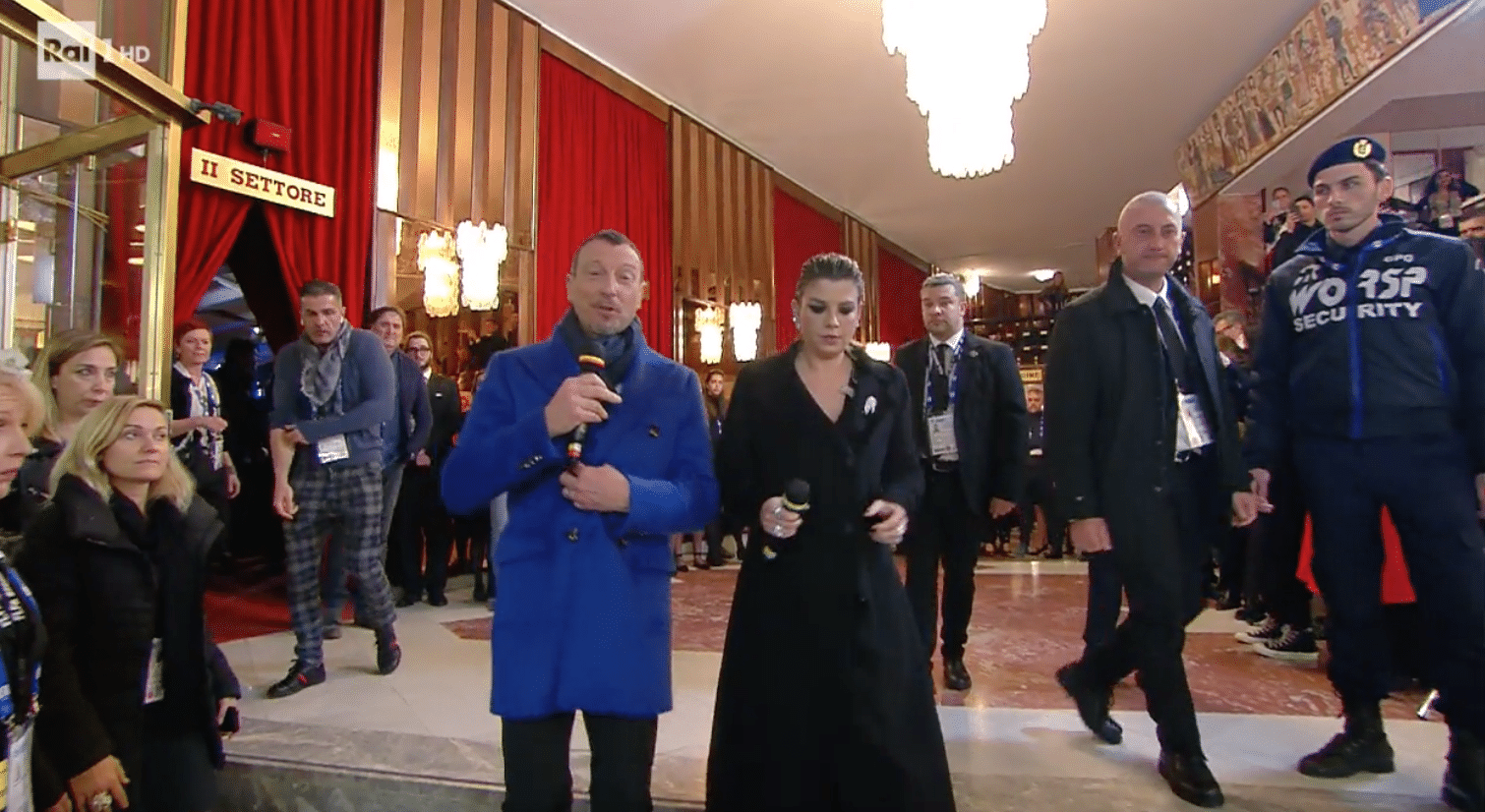 Terzo cambio d’abito a sorpresa per Amadeus, che indossa un cappotto azzurro per uscire dall’Ariston insieme ad Emma.