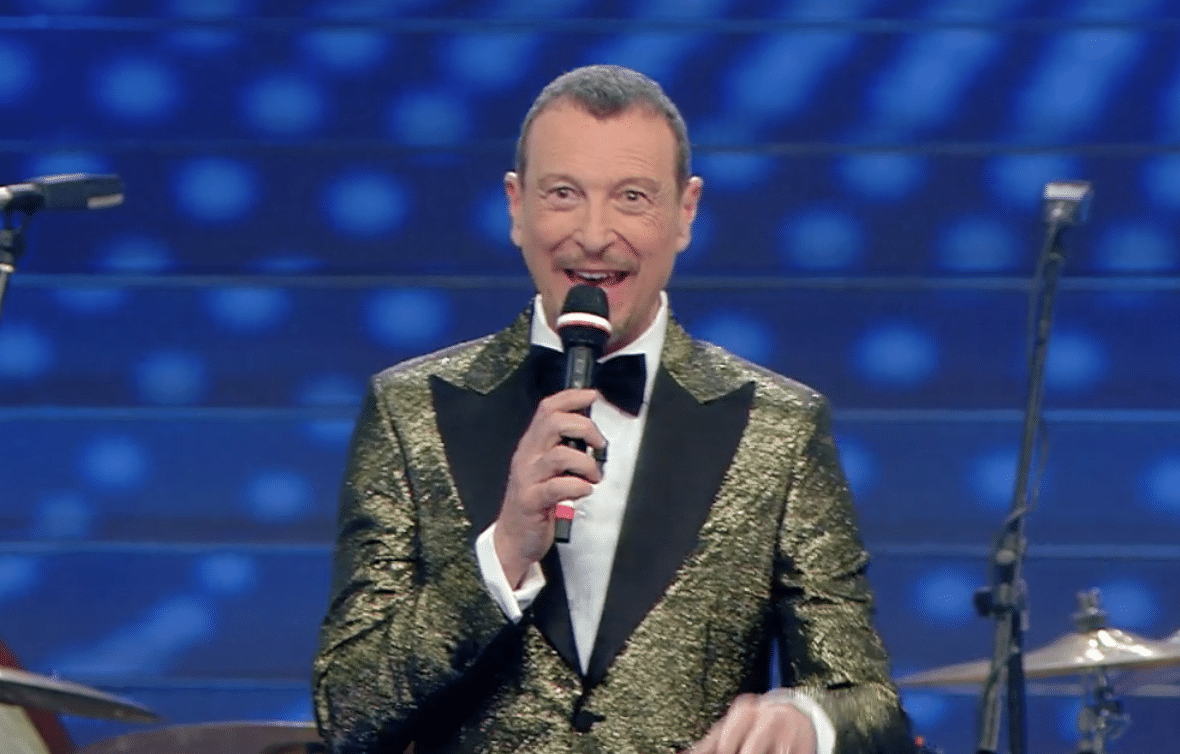 Il secondo abito di Amadeus ha toni più vicini al dorato e Amadeus lo indossa per presentare Zucchero.