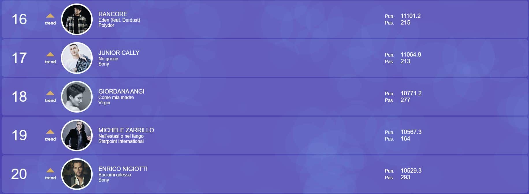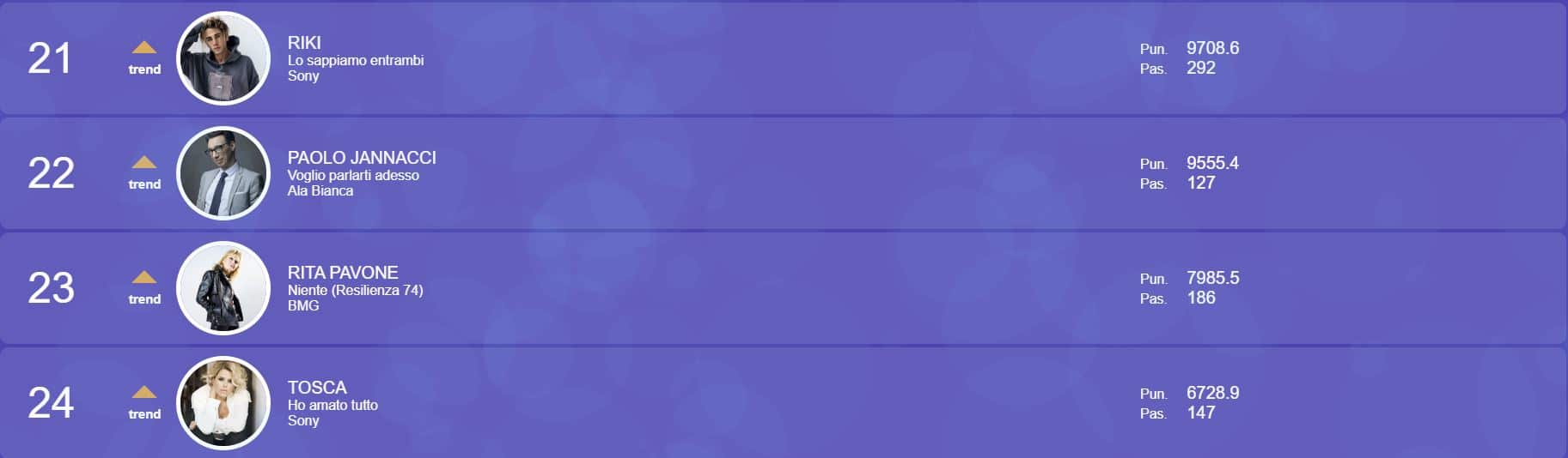I dati della classifica mostrano il numero di passaggi in radio (Elodie supera i 700, Tosca i 140) e un punteggio, che è un valore relativo al “peso” della radio che passa la canzone a seconda dell’importanza su base nazionale. Ed è su questi dati che è stata stilata la classifica.