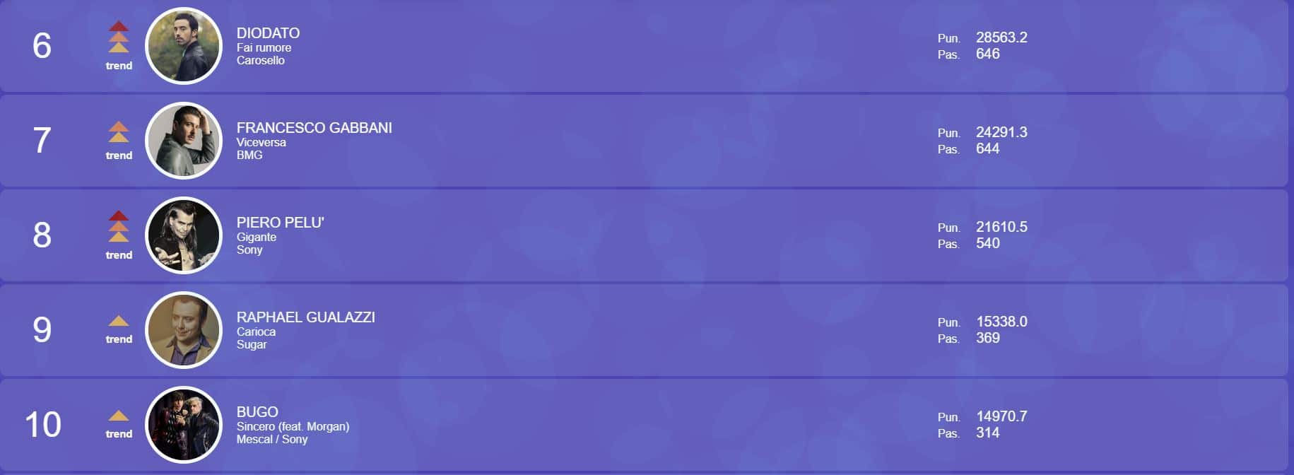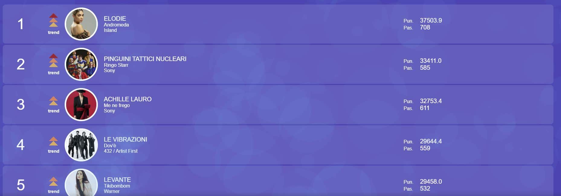 Una graduatoria molto diversa da quella finale del Festival: Diodato - vincitore all'Ariston - è fuori dal podio, mentre i vari Achille Lauro, Elettra Lamborghini e Junior Cally registrano ottimi piazzamenti