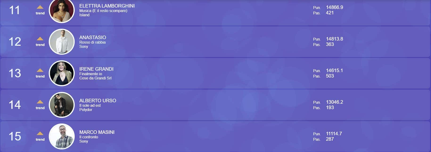 Buono il piazzamento di Elettra Lamborghini (undicesima), seguita da Anastasio, Irene Grandi, Alberto Urso, Marco Masini, Rancore, Junior Cally, Giordana Angi, Michele Zarrillo ed Enrico Nigiotti. A chiudere questa classifica Riki, Paolo Jannacci, Rita Pavone e – ultima – Tosca.