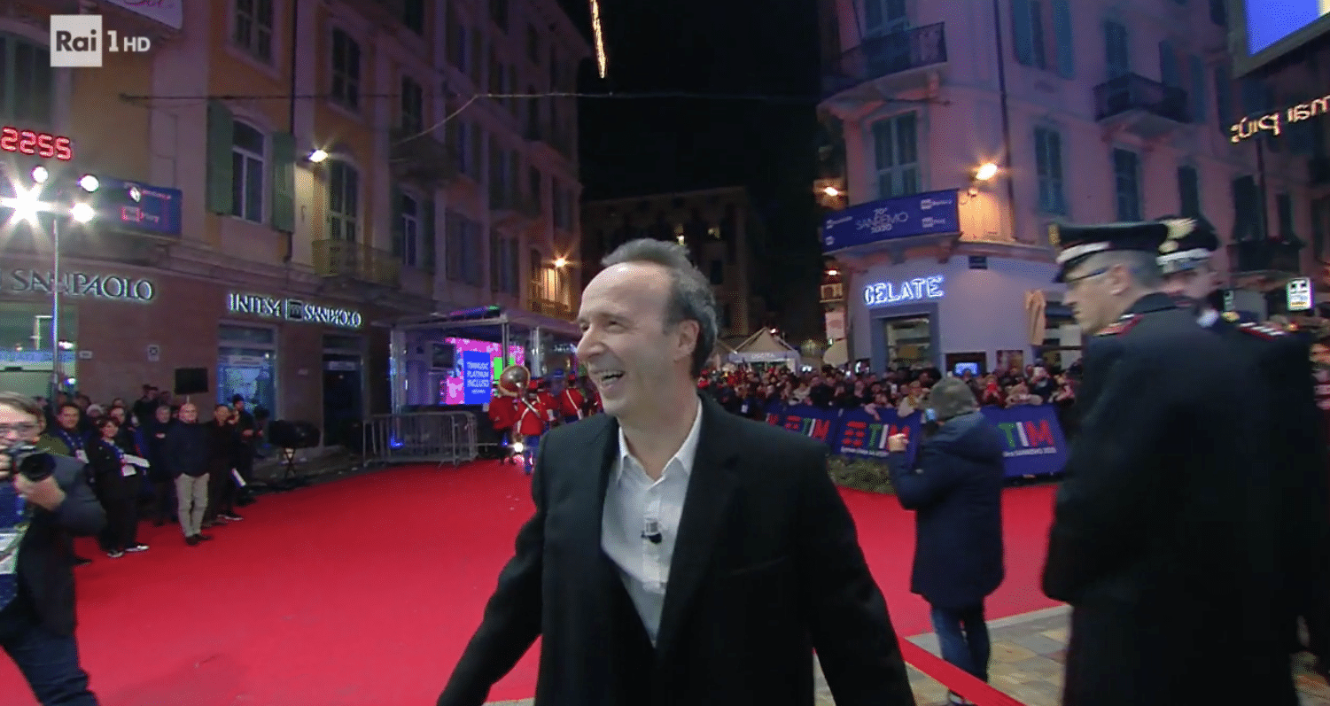- Benigni arriva accompagnato da una banda che lo accompagna dall’esterno del teatro Ariston: “Il più bell’ingresso…”