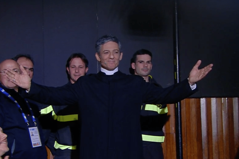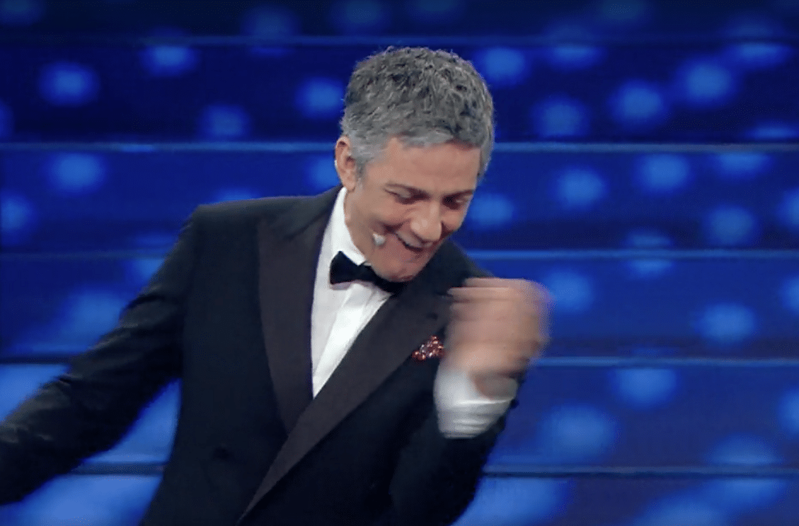 Rosario Fiorello sorprende l’Ariston e fa il suo ingresso travestito da prete. Esclama: “Scambiatevi un segno di pace”. E dopo un po’ rivela: “Questo è l’abito originale di Don Matteo, uno dei pochi Mattei che funziona in Italia”.