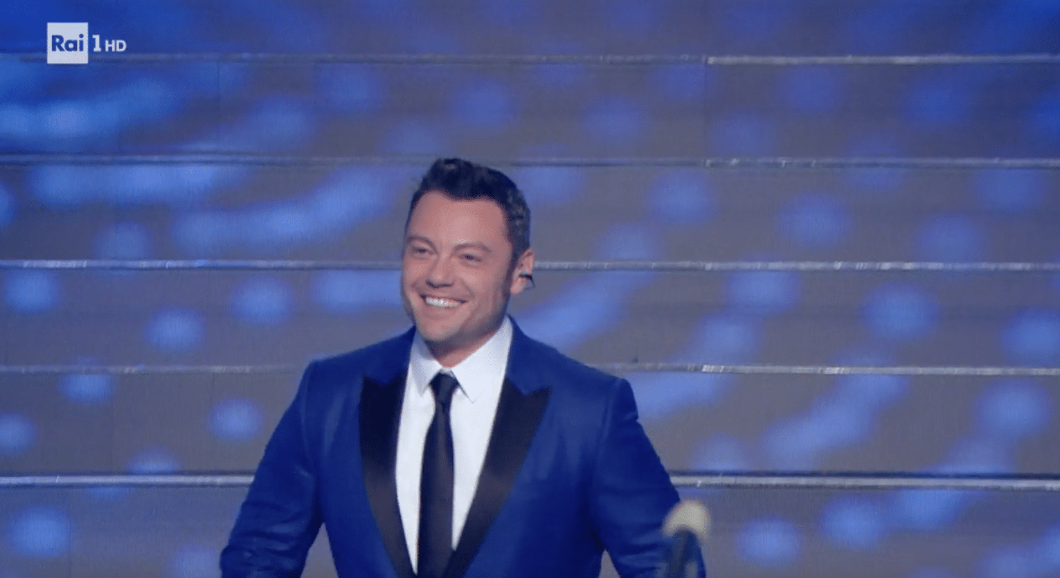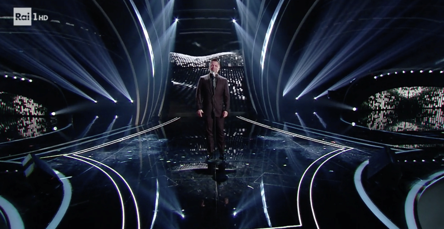 Il cantante di Latina scende le scale del palco in smoking nero classico cantando “Nel blu dipinto di blu” di Domenico Modugno.