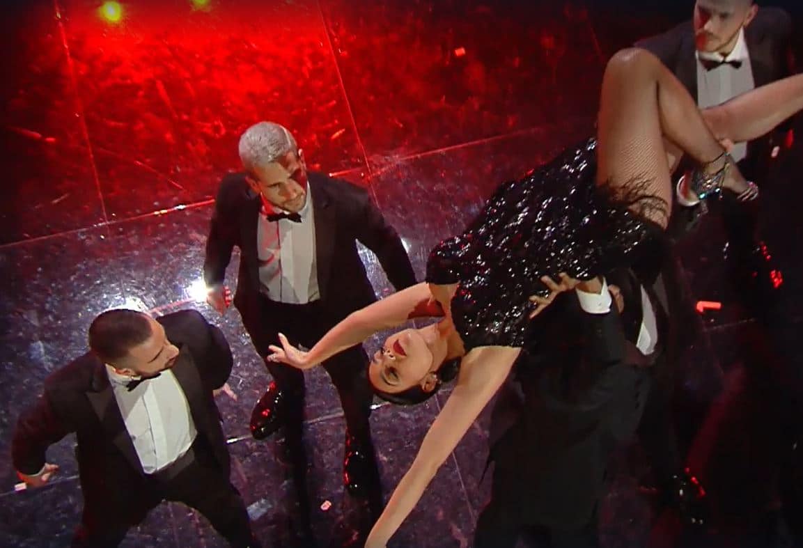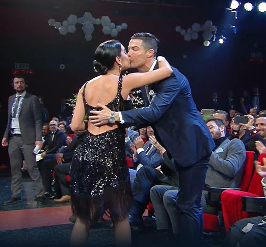 Il bacio tra Georgina Rodriguez e il fidanzato Cristiano Ronaldo al termine della sua performance sul palco dell’Ariston: