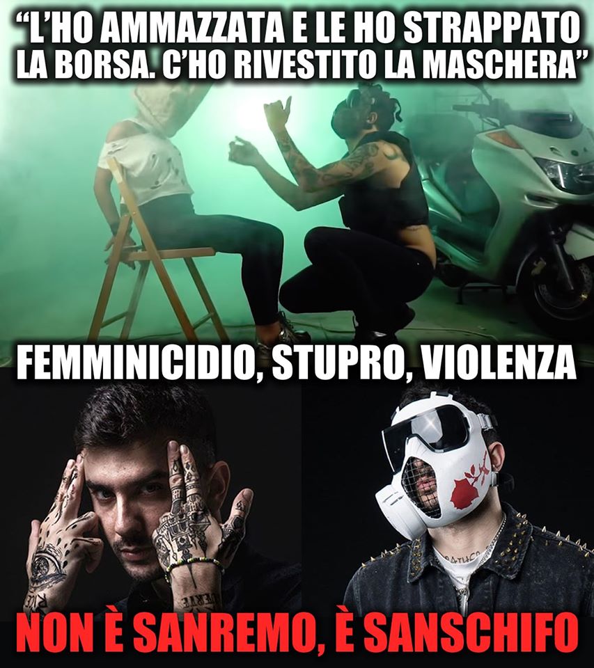 La Borgonzoni ha espresso il suo commento via Facebook, allegando un’immagine esplicativa del suo pensiero. “Come donna prima di tutto e come politico denuncio con rabbia questo scempio, è un’offesa a tutte le donne, uno schiaffo alle famiglie delle vittime di femminicidio. Uno che canta ‘l’ho ammazzata, le ho strappato la borsa. C’ho rivestito la maschera’ mentre si muove davanti a una giovane ragazza legata mani e piedi a una sedia e con un sacchetto sulla testa, mentre cerca, inutilmente, di liberarsi non è arte. È schifo, violenza, aberrazione”.