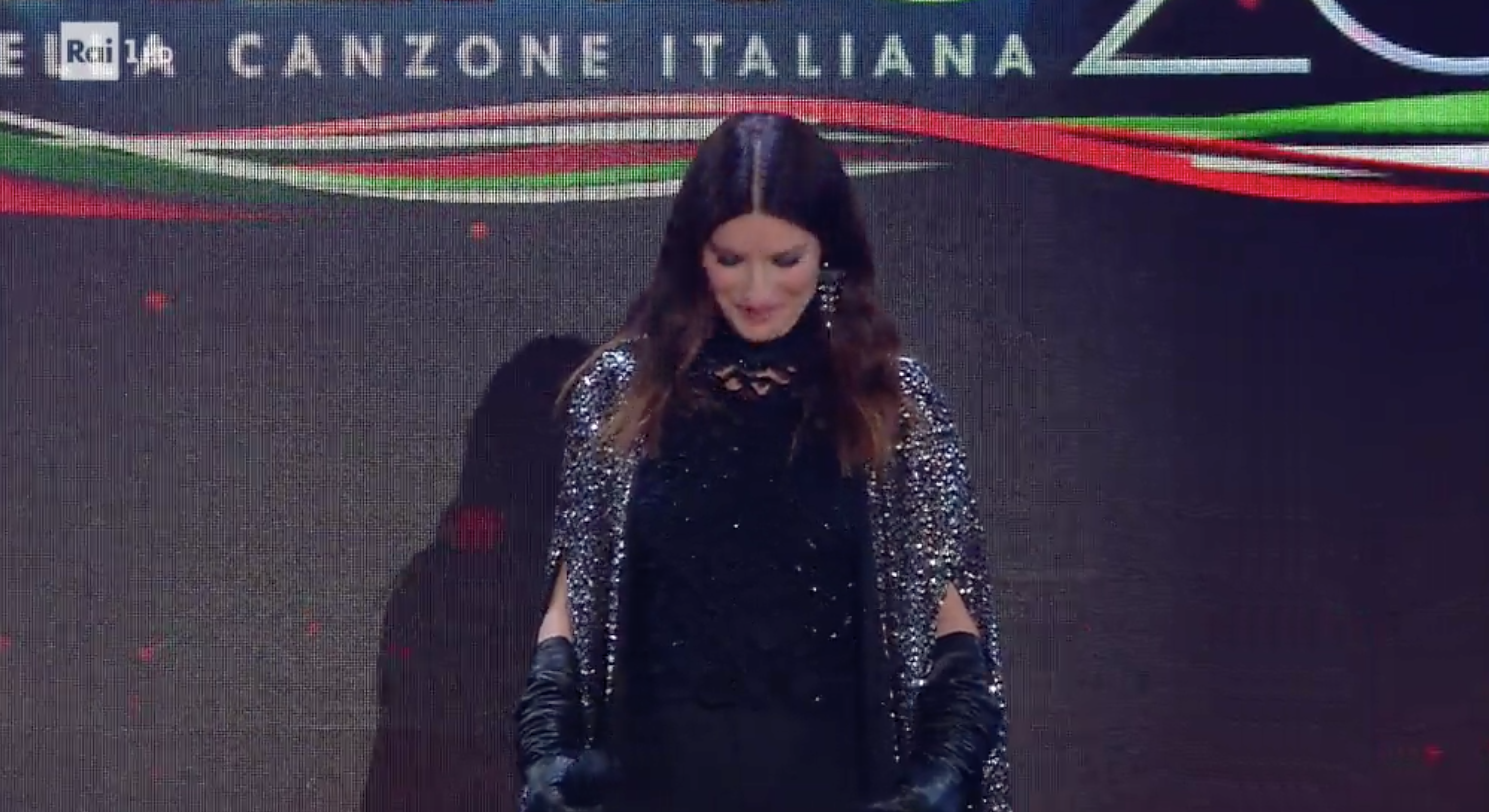 Pantaloni neri, maglietta nera, una lunga mantella di paillettes e guanti: è il dress code scelto da Laura Pausini per il suo ritorno sul palco dell’Ariston.