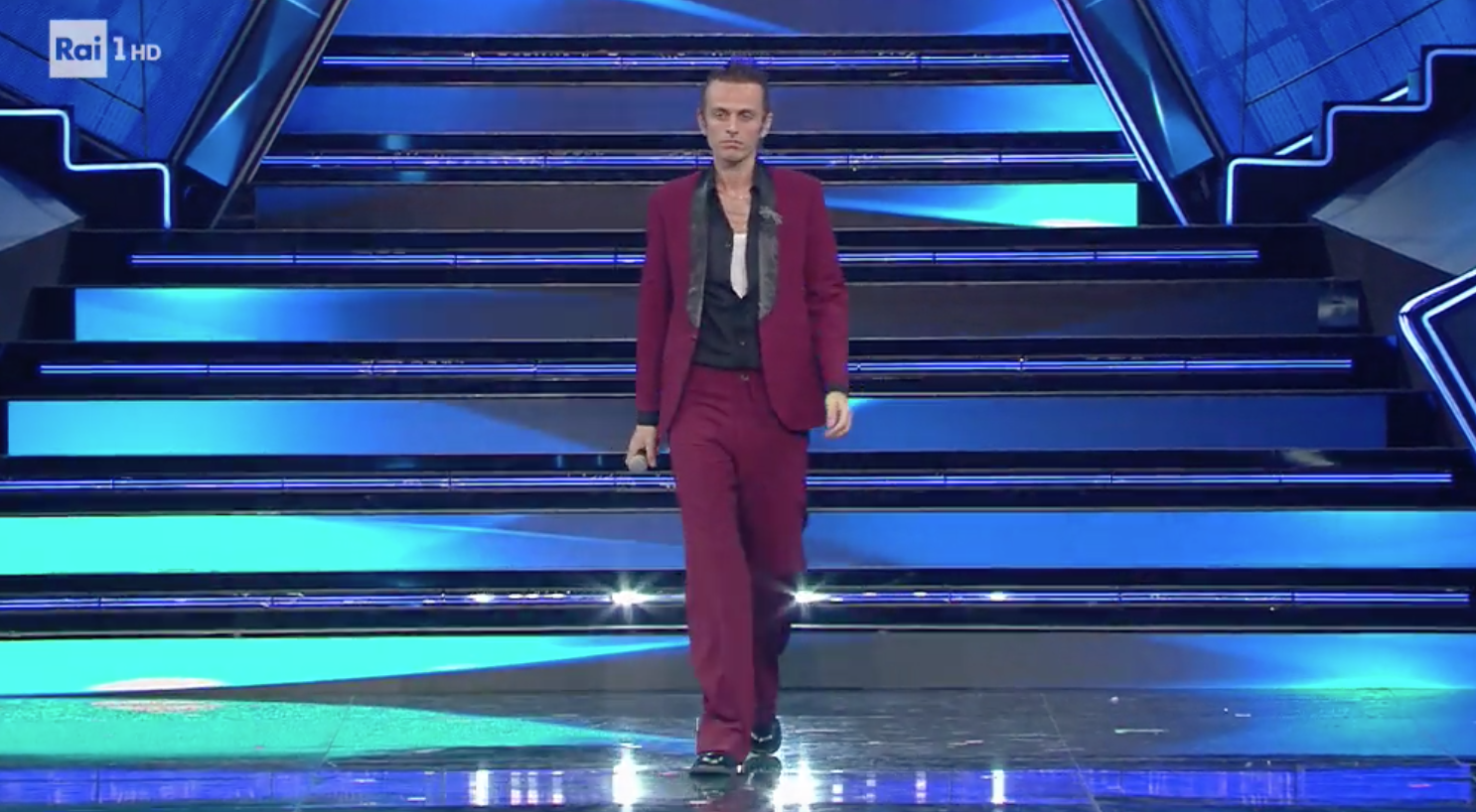 È stato il Festival dei brillantini e Swarovski sui capi da uomo, non vi sono dubbi. Giacca con profilo in cristalli, camicia in seta con dettagli in termo strass su collo e polsini, pantalone nero e stivaletto nero. Las Vegas anni 80? Tutto Dolce&Gabbana. VOTO: 7.