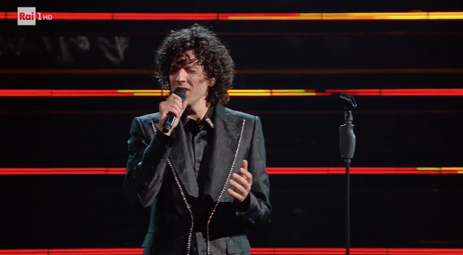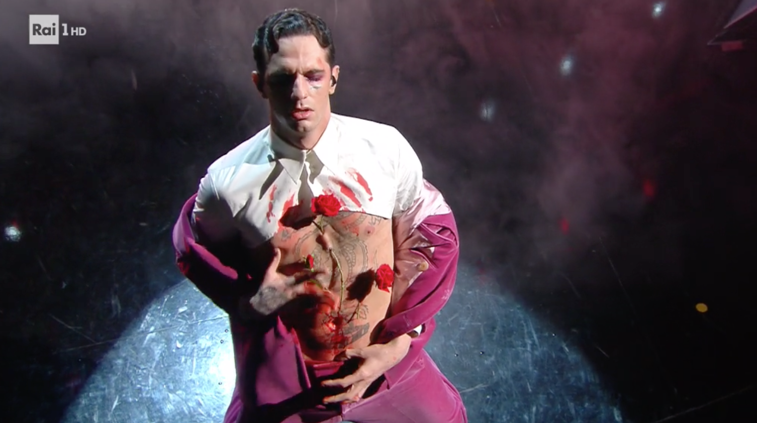 Per la finale, il cantante punta alla normalità. Completo 70’s con giacca dai revers a lancia. Un quadro più spento rispetto a quelli precedenti, che si conclude tra rose insanguinate ed elogio all‘umanità. VOTO 7-.