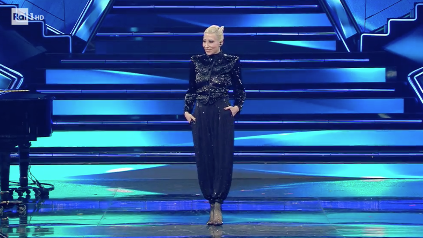 Anche se è la registrazione della prova generale, io il voto al look lo do lo stesso. Total look in pelle, rock e a tratti fetish. È vestito meglio di molti concorrenti che si sono visti, dal vivo, sul palco dell’Ariston nelle sere scorse, durante la gara. VOTO: 8.