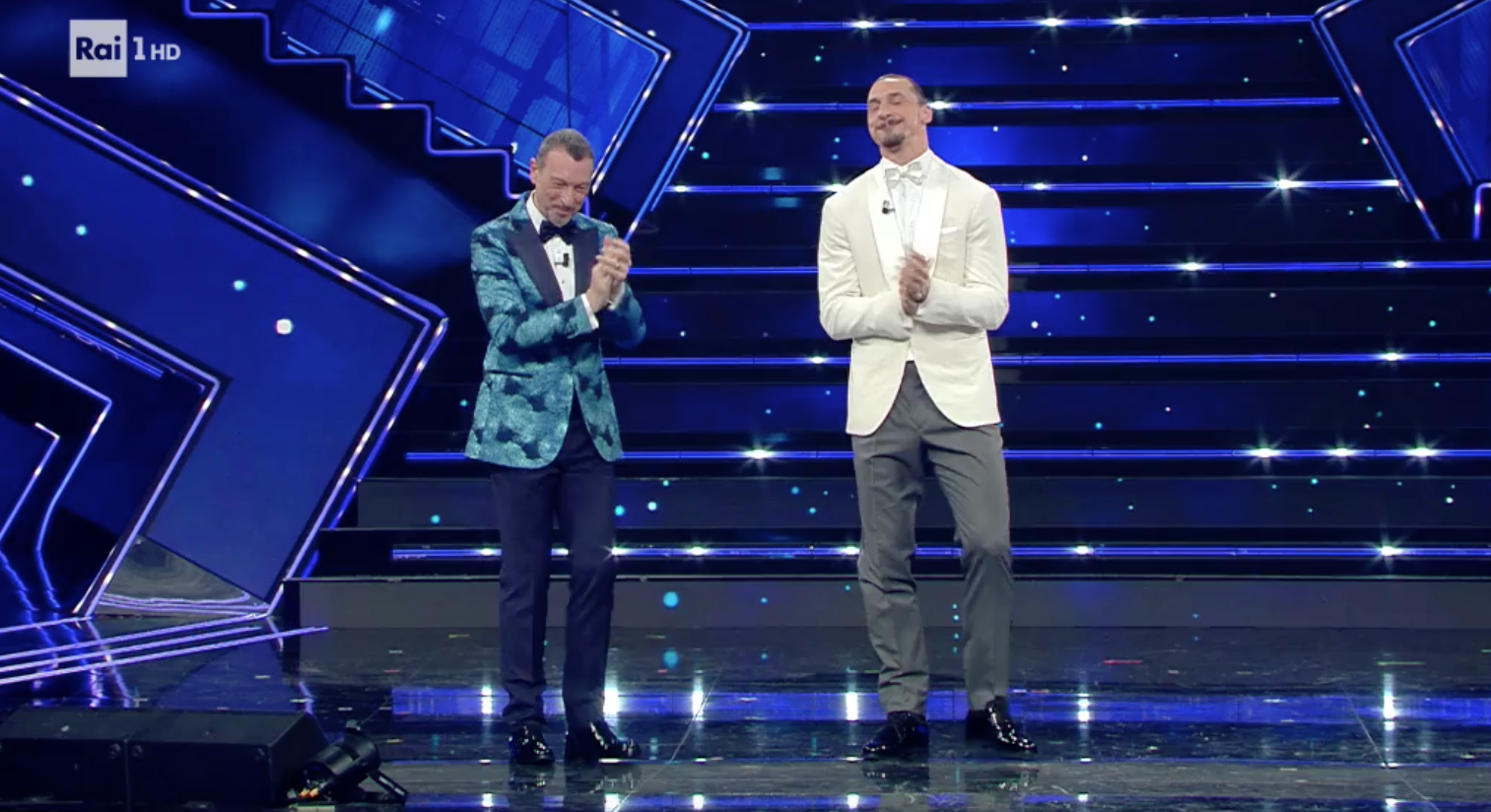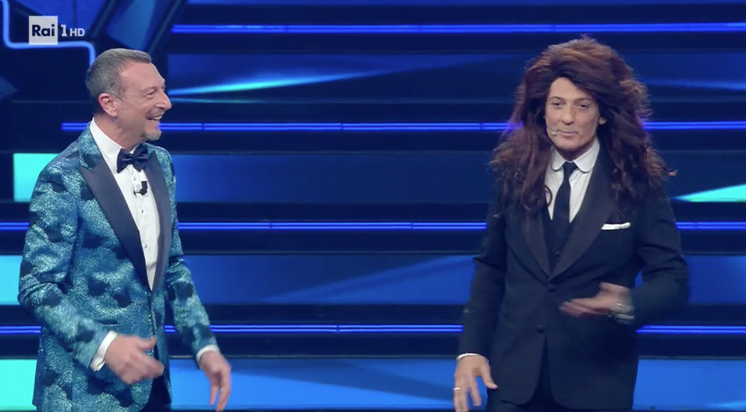 Nulla: mi arrendo. Non riusciremo mai a vederlo con un completo elegante e minimal. Almeno a Sanremo Questa sera la giacca è azzurra scintillante. Perché non prende spunto dai look di Fiorello? VOTO 5.