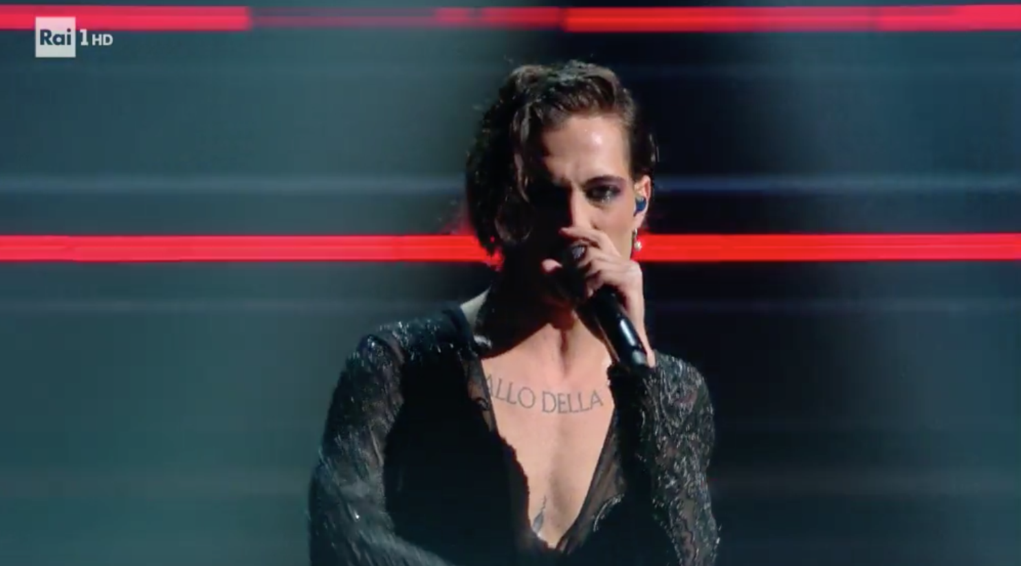 Look minimal ma super ricercato, che cita il kilt brit, l’uniforme dei Samurai e lo urban evoluto. Firmato da Riccardo Tisci, direttore creativo di Burberry. Una divisa realizzata ad hoc per il palco dell’Ariston, senza dimenticare di osare. VOTO: 9 (e un più alla regina dello styling italiano, Susanna Ausoni).