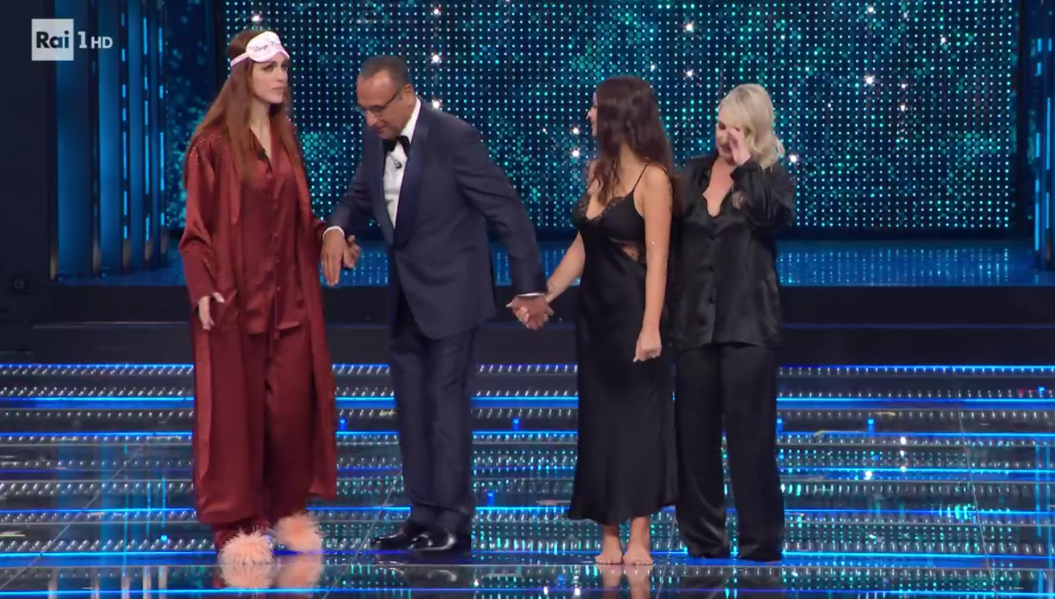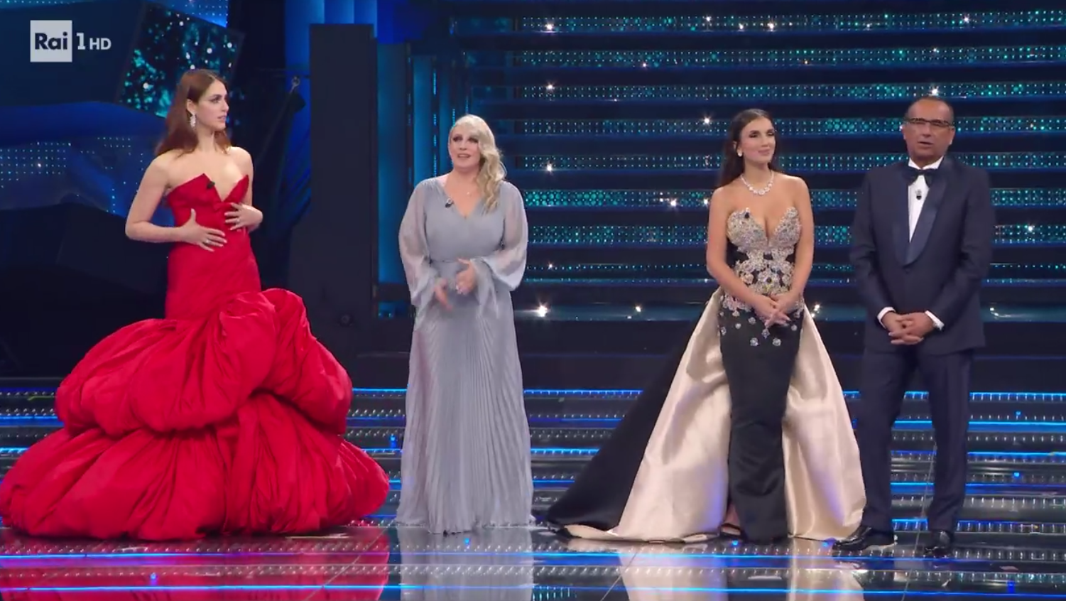 Sanremo 2025, gli abiti di Katia Follesa al Festival: abito, look, vestiti, stilista
