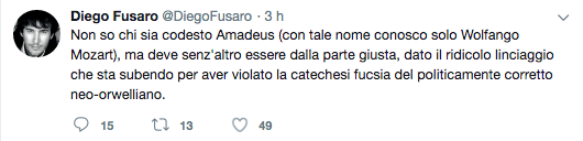 Sul suo profilo Twitter, infatti, Fusaro ha scritto: “Non so chi sia codesto Amadeus (con tale nome conosco solo Wolfango Mozart), ma deve senz’altro essere dalla parte giusta, dato il ridicolo linciaggio che sta subendo per aver violato la catechesi fucsia del politicamente corretto neo-orwelliano”.