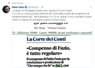 Il conduttore si è sfogato con un tweet in cui si legge: “Dopo un linciaggio durato anni, questo è l’ovvio finale”, e aggiunge: “Nel frattempo Che tempo che fa è su raidue, il mio contratto è stato rivisto e il danno di immagine subito è ormai subito”.