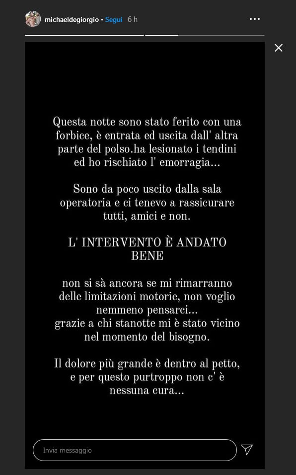 Anche l’amica Deianira Marzano ha commentato l’episodio e ha accusato l’attuale fidanzata di essere responsabile dell’aggressione. “È stato accoltellato dalla fidanzata”, ha spiegato la Marzano, “sono disgustata, ha provato ad ucciderlo”. Michael De Giorgio però non ha ancora confermato o smentito le accuse.
