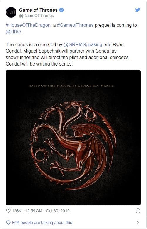 Come spiegato nel post su Twitter lo spinoff, basato sul libro Fire and Blood sempre di George R. R. Martin, sarà coprodotto da quest’ultimo e da Ryan Condal, al quale è affidata anche la sceneggiatura. Miguel Sapochnik, regista che ha diretto alcuni dei migliori episodi di GOT, si occuperà di girare alcune delle 10 puntate per ora previste de La casa del drago. Questa nuova – e già attesissima – serie fantasy racconterà quindi la dinastia Targaryen e l’ascesa al trono dei potenti sovrani antenati di Daenerys e Jon Snow.