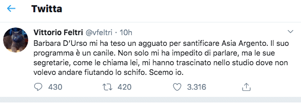 “Il suo programma è un canile”, ha detto Feltri dopo il confronto acceso avuto con Asia Argento, ospite anche lei della trasmissione della conduttrice napoletana. Secondo l’opinionista, Barbara D’Urso invitandolo in trasmissione gli avrebbe teso un agguato per “santificare” l’attrice al centro del caso Weinstein.