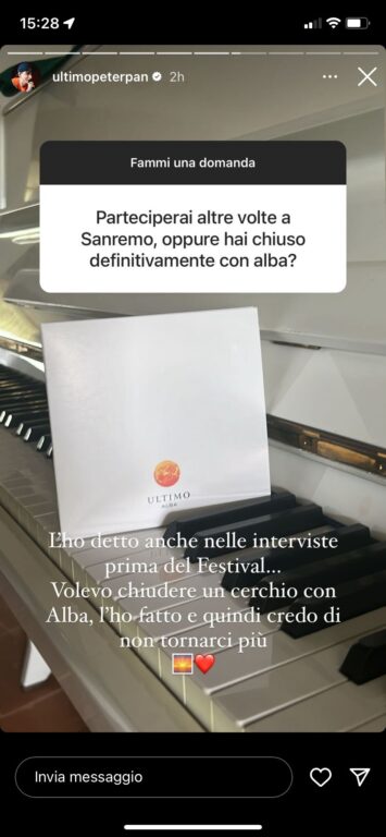 “So che nel disco ci sono canzoni più ‘dirette’ che su quel palco sarebbero arrivate più facilmente, ma Alba è una canzone diversa, che non ha la pretesa di entrare nel cuore di un pubblico più distratto. Alba ha bisogno di tempo e va ascoltata senza fretta. Come ho detto in alcune interviste, volevo tornare a Sanremo per chiudere un cerchio artistico, e se lo avessi fatto con un’altra canzone non avrebbe avuto senso. Ho sempre dato precedenza a quello che sento e non a quello che funziona”, ha detto Ultimo su Instagram, spiegando la sua decisione di tornare all’Ariston.