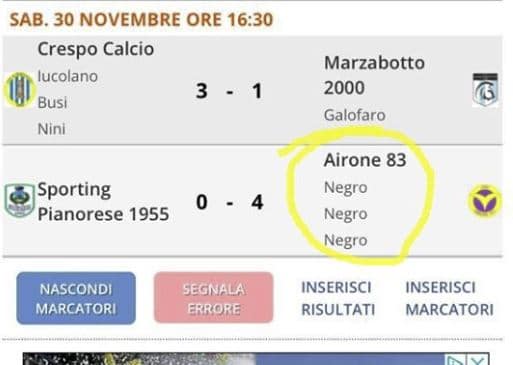 La foto riporta appunto la dicitura “negro” ripetuta per tre volte al posto del nome del calciatore che ha segnato tre reti.