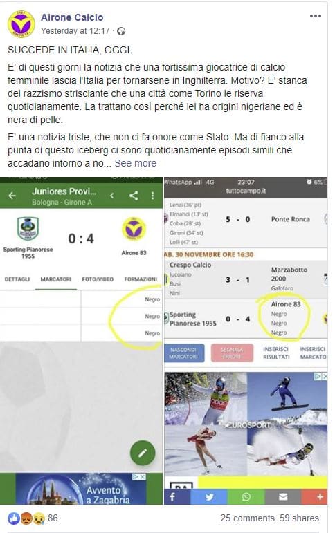 La società sportiva bolognese Airone Calcio ha denunciato l’ennesimo episodio di razzismo avvenuto su un campo di calcio su Facebook.