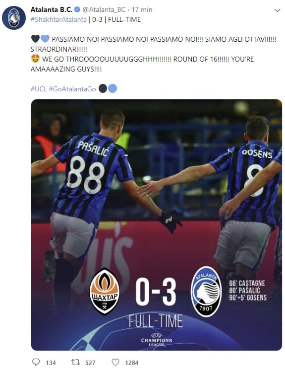 La squadra di Gasperini, dopo la storica qualificazione in Champions, ha scritto un altro capitolo indelebile della propria avvenuta europea: la prima volta agli ottavi di finale, tra le grandi del calcio mondiale. A determinare questo traguardo la vittoria in Ucraina per 3-0 dei nerazzurri e la contemporanea vittoria del City in trasferta a Zagabria contro la Dinamo (1-4). L’Atalanta chiude così il girone C al secondo posto con 7 punti.