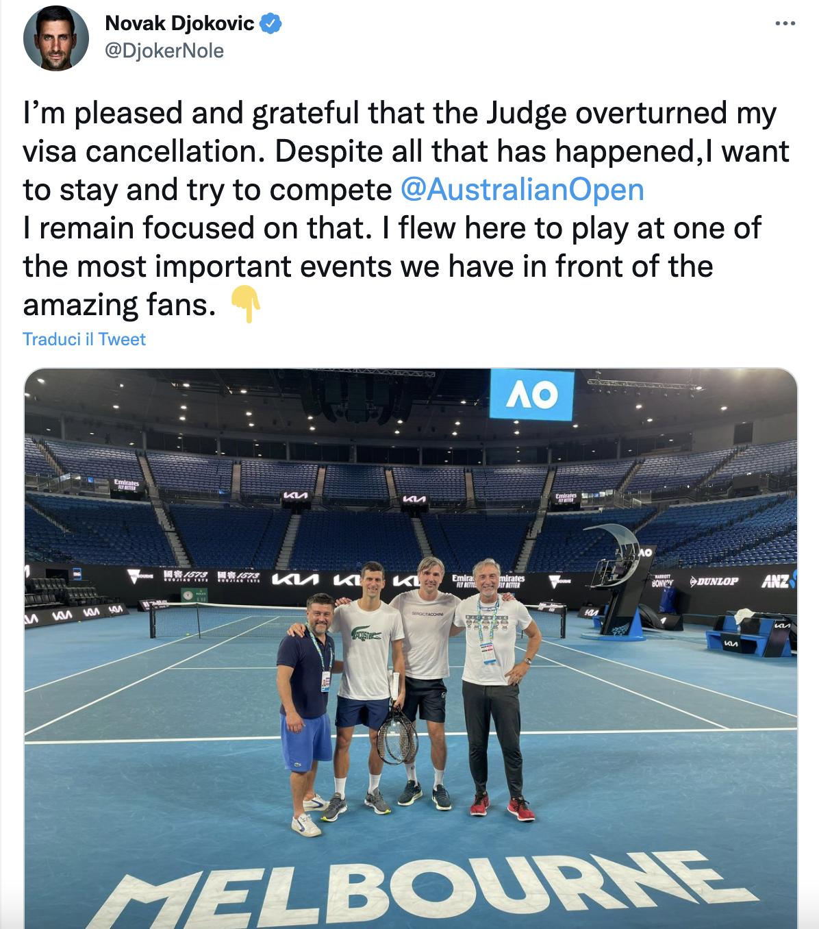Proprio dal Laver Arena, dove ha iniziato ad allenarsi in vista della competizione, il numero uno del tennis mondiale ha scritto sui social: “Sono lieto e grato che il giudice abbia annullato la mia cancellazione del mio visto. Nonostante tutto quello che è successo, voglio restare e provare a competere per gli Australian Open. Sono volato qui per prendere parte a uno degli eventi sportivi più importanti”.