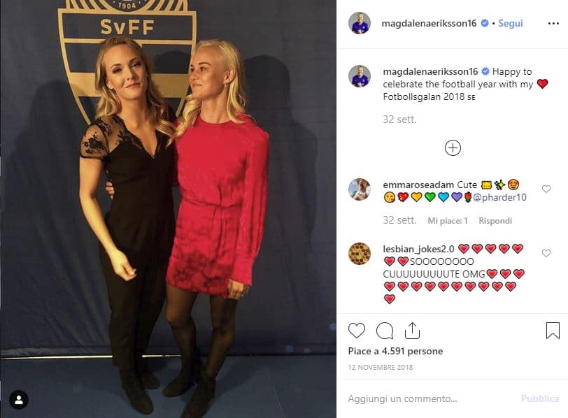 La fidanzata, la danese Harder che milita nel Wolfsburg, l’ha raggiunta in campo indossando la maglia della Svezia e l’ha baciata davanti a tutti per festeggiare il risultato.
