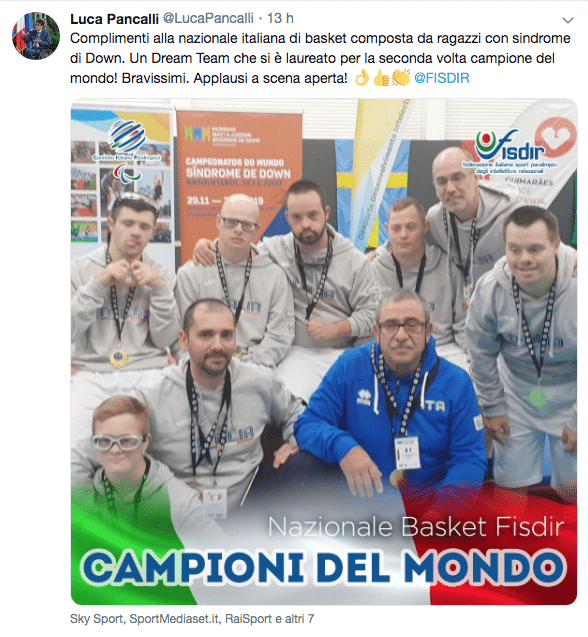 “Complimenti alla nazionale italiana di basket composta da ragazzi con sindrome di Down. Un Dream Team che si è laureato per la seconda volta campione del mondo! Bravissimi. Applausi a scena aperta”, ha commentato il presidente del Cip, Comitato Italiano Paralimpico, Luca Pancalli.
