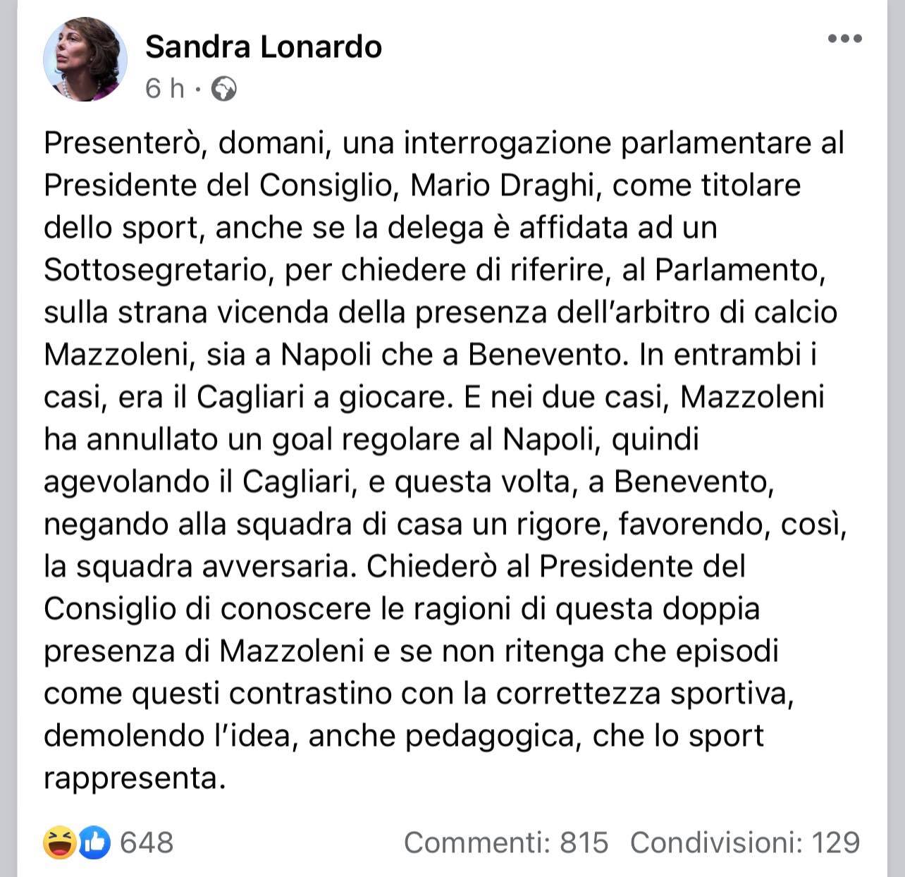 “In entrambi i casi – ha aggiunto – era il Cagliari a giocare. E nei due casi, Mazzoleni ha annullato un gol regolare al Napoli, quindi agevolando il Cagliari, e questa volta, a Benevento, negando alla squadra di casa un rigore, favorendo così la squadra avversaria. Chiederò al Presidente del Consiglio di conoscere le ragioni di questa doppia presenza di Mazzoleni e se non ritenga che episodi come questi contrastino con la correttezza sportiva, demolendo l’idea, anche pedagogica, che lo sport rappresenta”.
