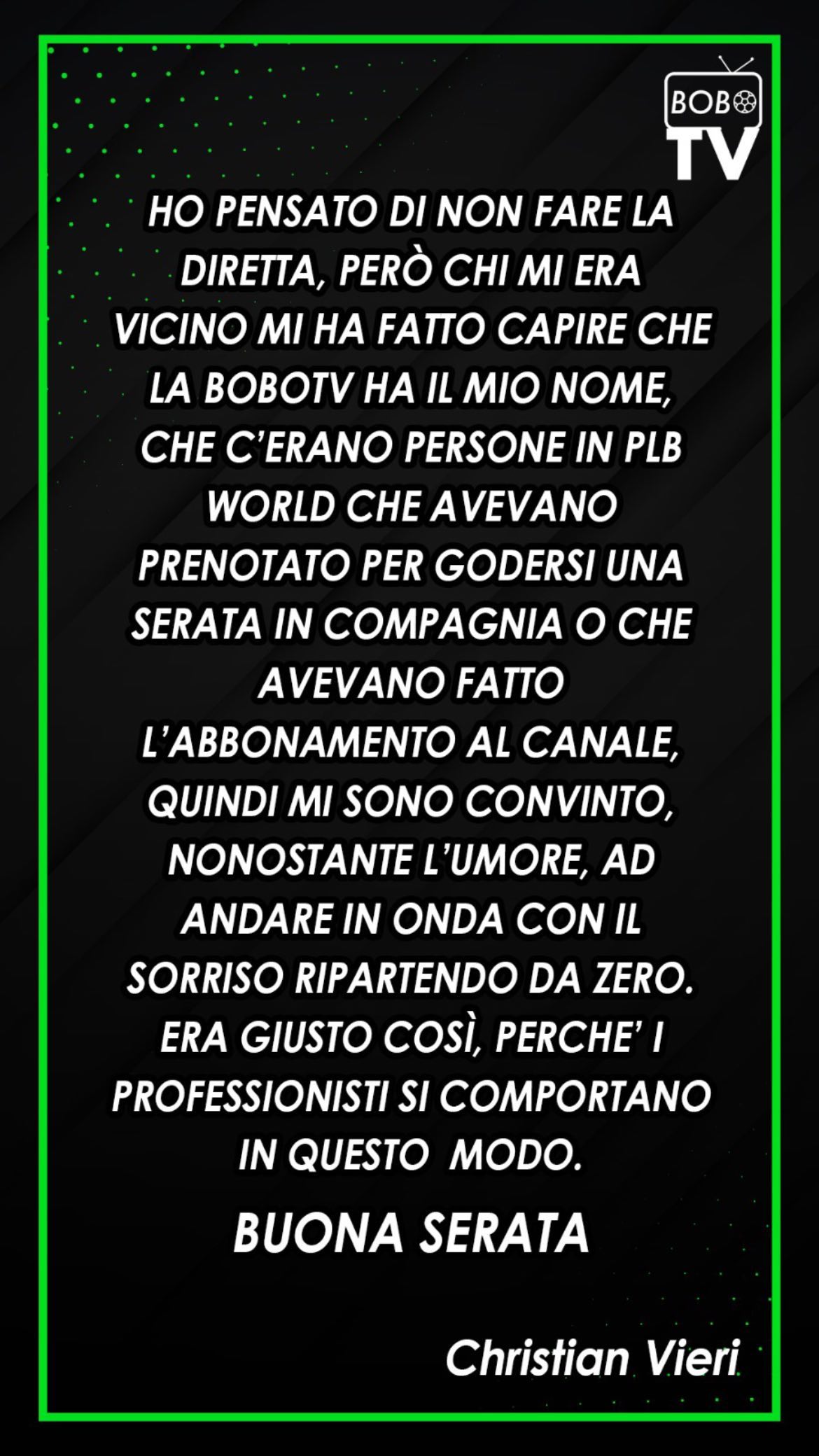 Christian Vieri, quindi, conclude: “Ho pensato di non fare la diretta, però chi mi era vicino mi ha fatto capire che la Bobo Tv ha il mio nome. Che c’erano persone in Plb World che avevano prenotato per godersi una serata in compagnia o che avevano fatto l’abbonamento al canale”.