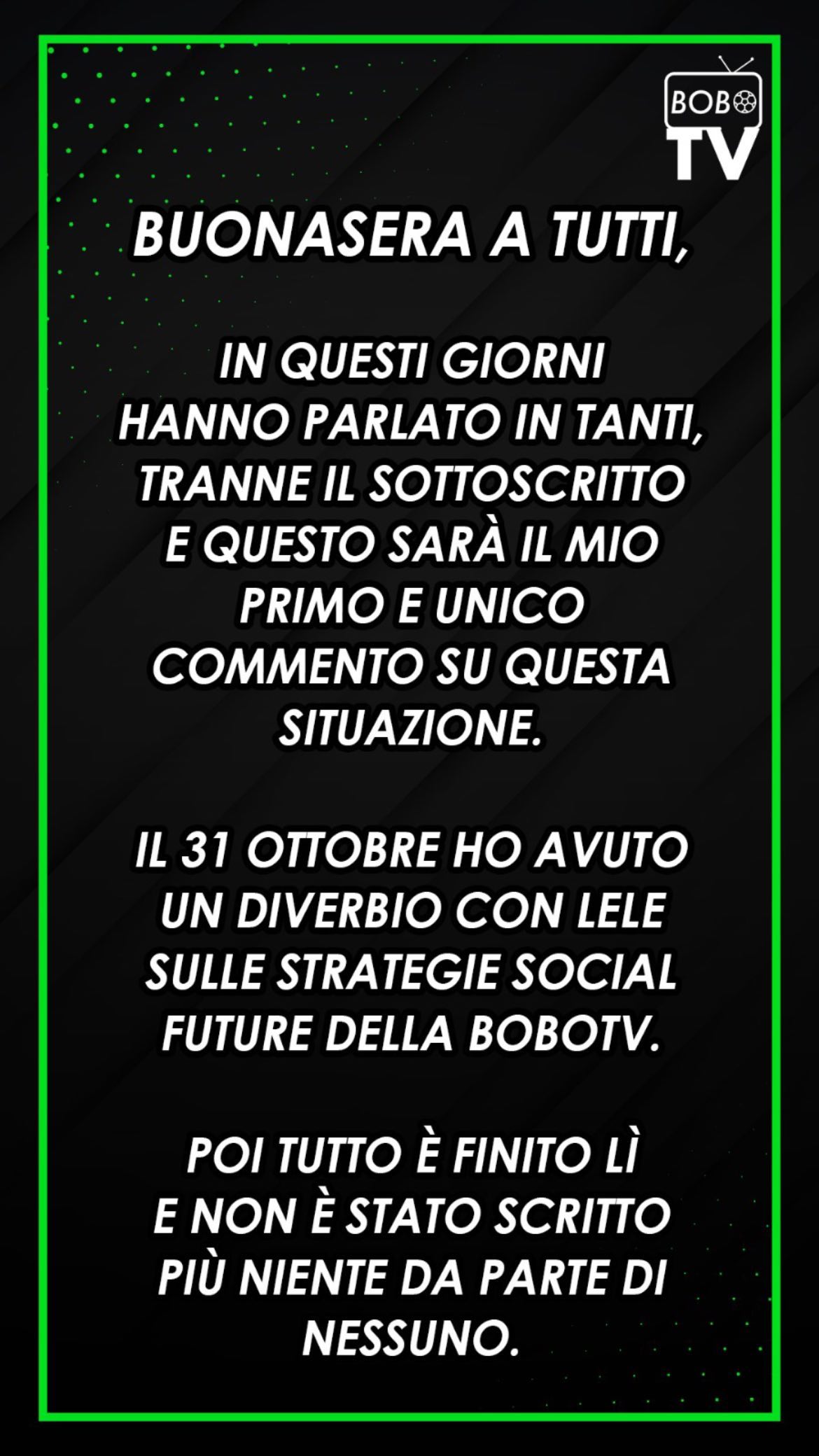 “Il 31 ottobre ho avuto un diverbio con Lele sulle strategie social future della Bobo Tv. Poi tutto è finito lì e non è stato scritto più niente da parte di nessuno”.