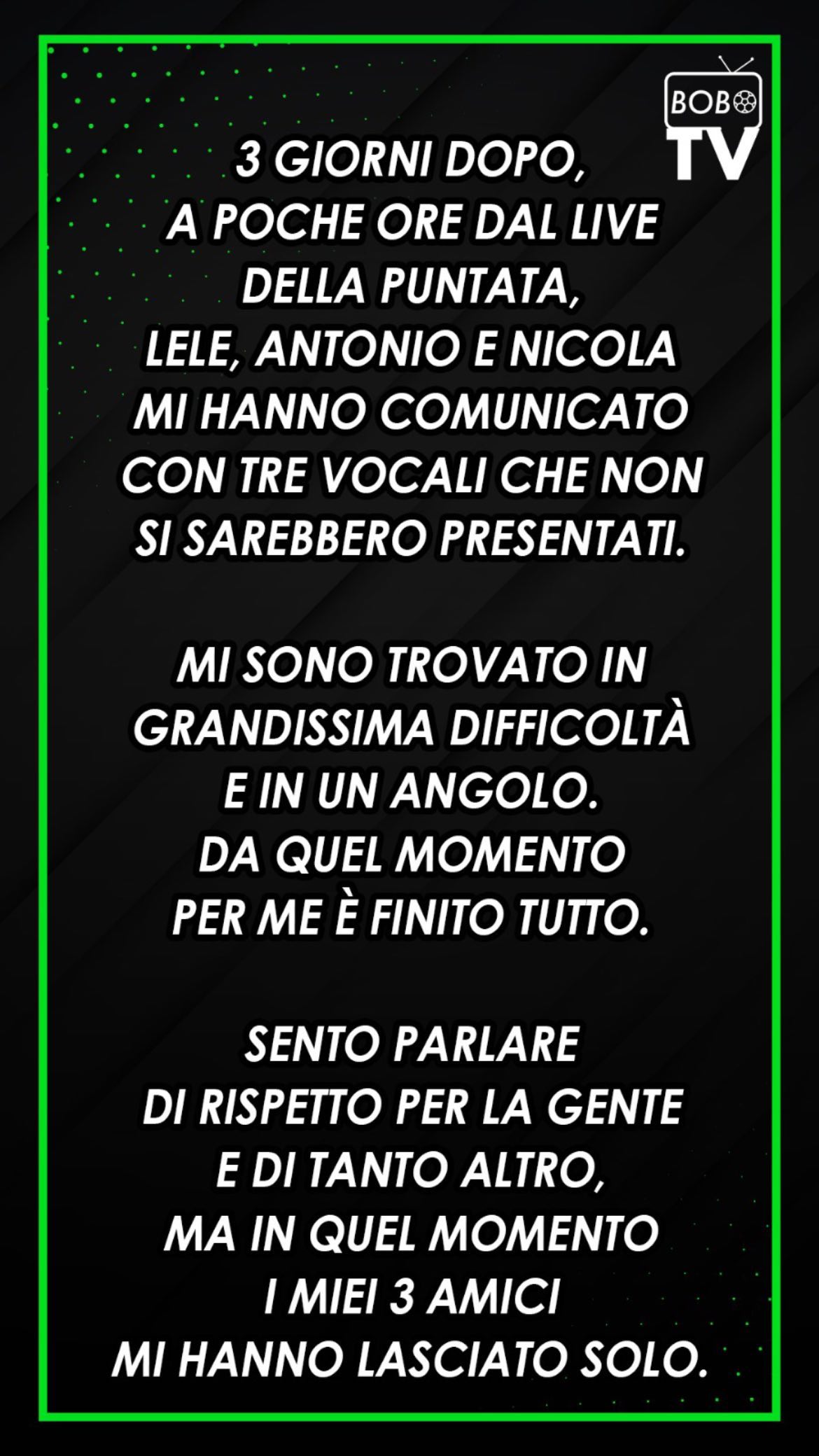 La situazione, secondo quanto racconta Vieri, cambia 3 giorni dopo quando “a poche ore dal live della puntata, Lele, Antonio e Nicola mi hanno comunicato con tre vocali che non si sarebbero presentati. Mi sono trovato in difficoltà e in un angolo. Da quel momento per me è finito tutto”.