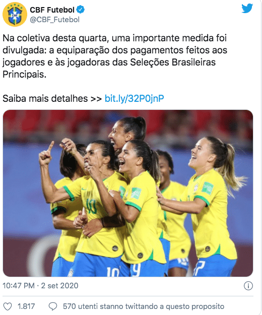 I rimborsi distribuiti per i periodi di preparazione e i premi partita avranno dunque lo stesso valore tra le squadre maschili e quelle femminili. Insieme all’Inghilterra, che quasi in contemporanea ha annunciato di fare lo stesso dallo scorso gennaio, il Brasile è il primo grande paese calcistico ad adottare la parità di retribuzione, una pratica introdotta inizialmente nel calcio femminile da Norvegia, Nuova Zelanda e Australia.
